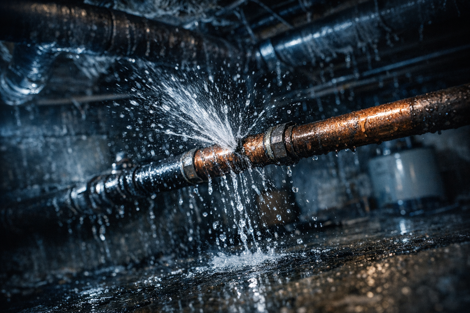 Sudden pipe failures from corrosion, freezing, or pressure buildup. We locate, isolate, and repair — fast.